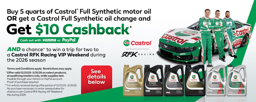 Successfully verified Rebate submissions are automatically entered into the Sweepstakes. See full Official Rules for details. To enter without purchase, handprint your full name, street address, city, state and zip code, day and evening telephone numbers (including area codes), and e-mail address on a 3"x5" postcard/paper and mail in a #10 sealed envelope with proper postage affixed to: Castrol RFK Q1 2026 Sweepstakes, c/o Arrowhead Promotion & Fulfillment Co., Inc., P.O. Box 4006, Dept R13994, Grand Rapids, MN 55730, to be postmarked by 03/31/2026 and received by 04/30/2026.